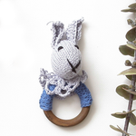Pequeño cascabel de carita de conejo, tejido en palillos con suave algodón en tonos celestes.