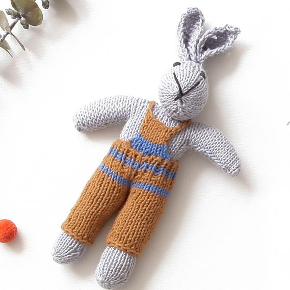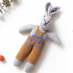 Delicado conejo tejido a palillo con suave algodón en tonos celestes y pasteles.