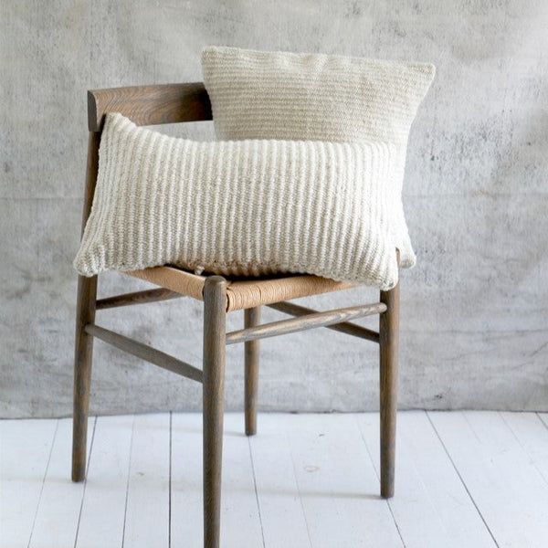 Funda cojín rectangular 100% lana de oveja. Modelo carancho, diseño tradicional mapuche que otorga una textura acordonada.  Bicolor de lana de oveja, tejida a mano en telar Mapuche. Al ser un producto hecho a mano, es único y sus medidas y tonalidad pueden variar de un ejemplar a otro.