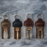 Llaveros de huinchas tejidas a mano en telar mapuche o  telar inkle, por artesanas de diferentes localidades de la región de Valparaíso. Elaborados 100% artesanal con fibras naturales de oveja y algodón, disponibles en distintos colores. Terminados en cuero y mosquetón metálico.